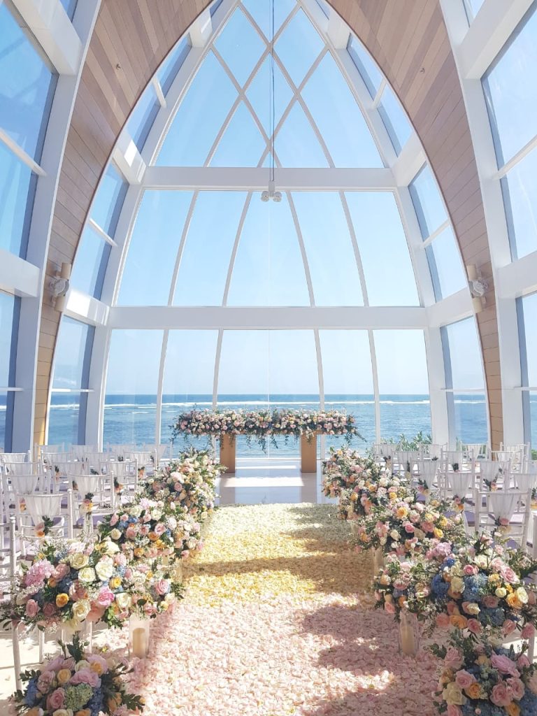 寶格麗婚禮教堂,位於峇里島的寶格麗度假酒店內,這座五星級精品酒店坐落在懸崖之巔,擁有無邊際水池設計,將壯闊海景盡收眼底。婚禮教堂,以其無與倫比的海景背景和獨特的設計風格,成為峇里島婚禮場地中的璀璨明珠。教堂的設計完美貫徹了傳統寶格麗意大利的獨特而優雅風格,巧妙地將峇里島著名的Kerobokan石頭與手工製作的落地玻璃鑲板結合在一起,無縫融合,營造出一個既完美又和諧的環境。聖壇鋪設著潔白的地毯,周圍可點綴以雞蛋花或粉色玫瑰,花瓣鋪滿長長的走道,或結成拱門狀,營造出極致夢幻的氛圍。這裡曾見證過陳凱琳、楊冪、林心如等眾多明星的幸福時刻,成為無數新人嚮往的婚禮聖地。