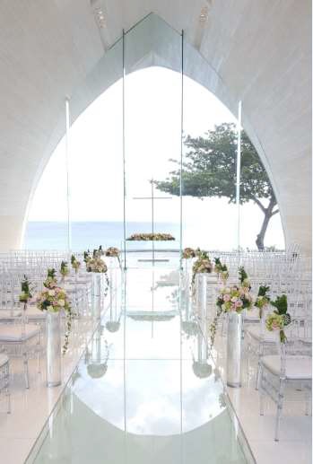阿雅娜爵士娜教堂,隱匿於峇里島阿雅娜度假村內,以其優雅大器的設計風格脫穎而出。教堂的最大特色是整塊透明的綠色玻璃,屋頂呈尖頂形狀,儀式感滿滿。教堂周圍環境優美,無敵海景與綠色草坪相映成趣,碧海藍天的景致為新人的婚禮增添了一份浪漫與莊重。在這裡,新人可以以天為誓,以海為證,許下永恆的承諾。