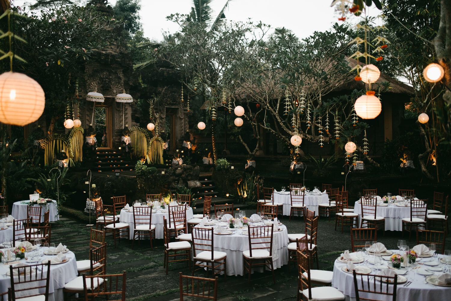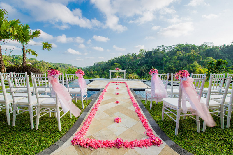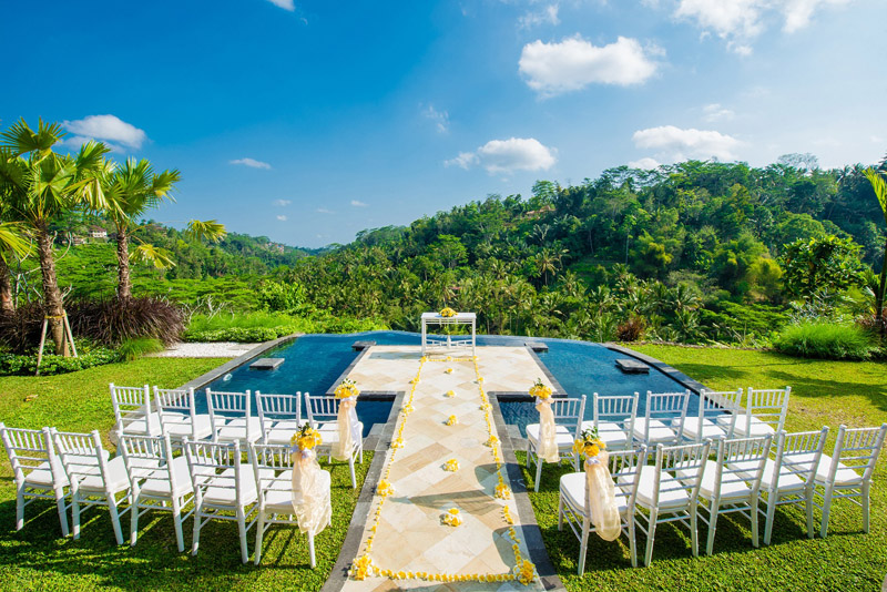 Ayung Waters的設計靈感來源於峇裡島的傳統與自然元素,其建築風格與周圍的自然環境和諧相融。婚禮場地的設計巧妙地利用了地形的優勢,讓新人可以在懸崖邊的平臺上,俯瞰著下方的河流和山谷,許下他們的愛情誓言。